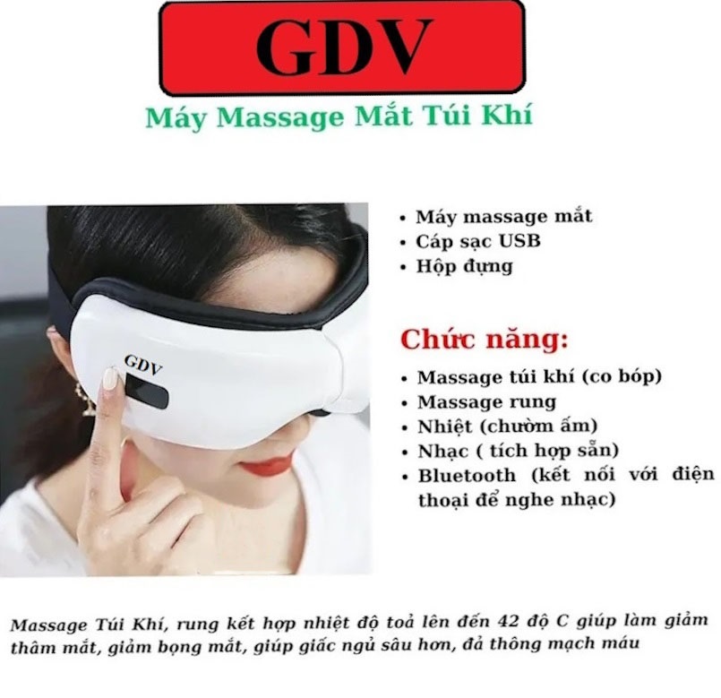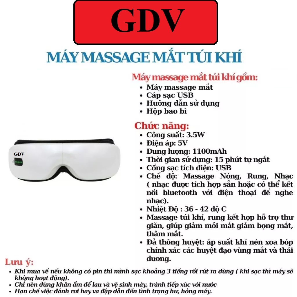 - Tên sản phẩm: Máy Massage Mắt GDV Kết Hợp Chế Độ Rung Kết Nối Bluetooth, Làm Giảm Căng Thẳng Mệt Mỏi Và Lưu Thông Máu Cho Mắt - Hàng Chính Hãng